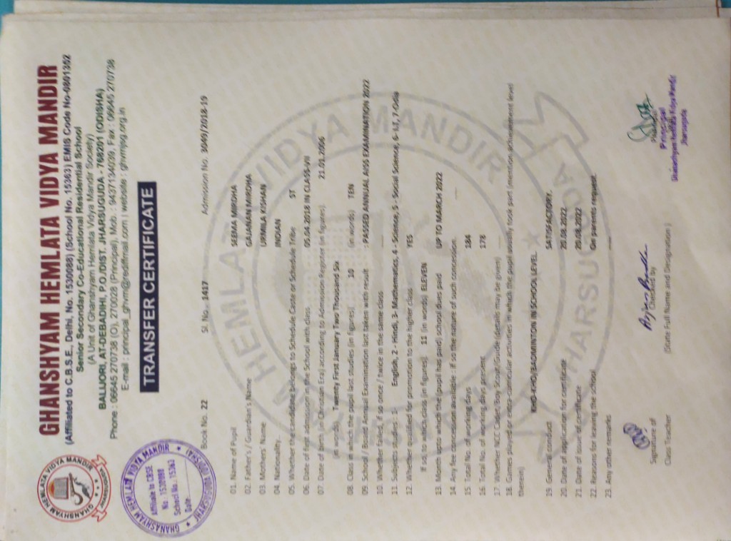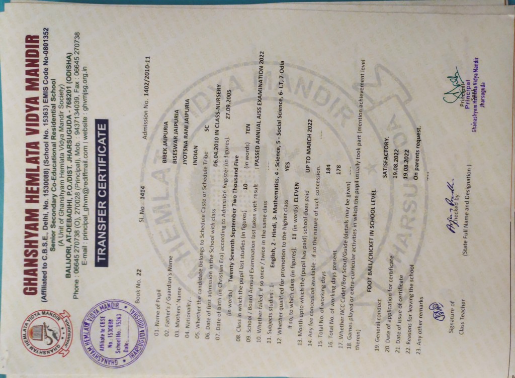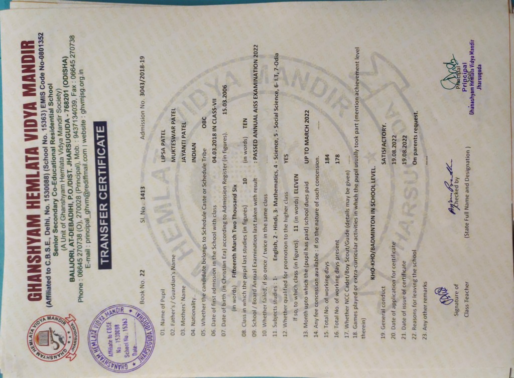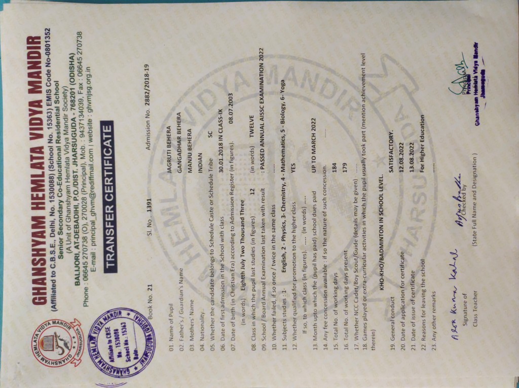 | 11 | 13-8-2022 | 1391 | Jagruti Behera | 2882/2018-19 | View/Download TC |