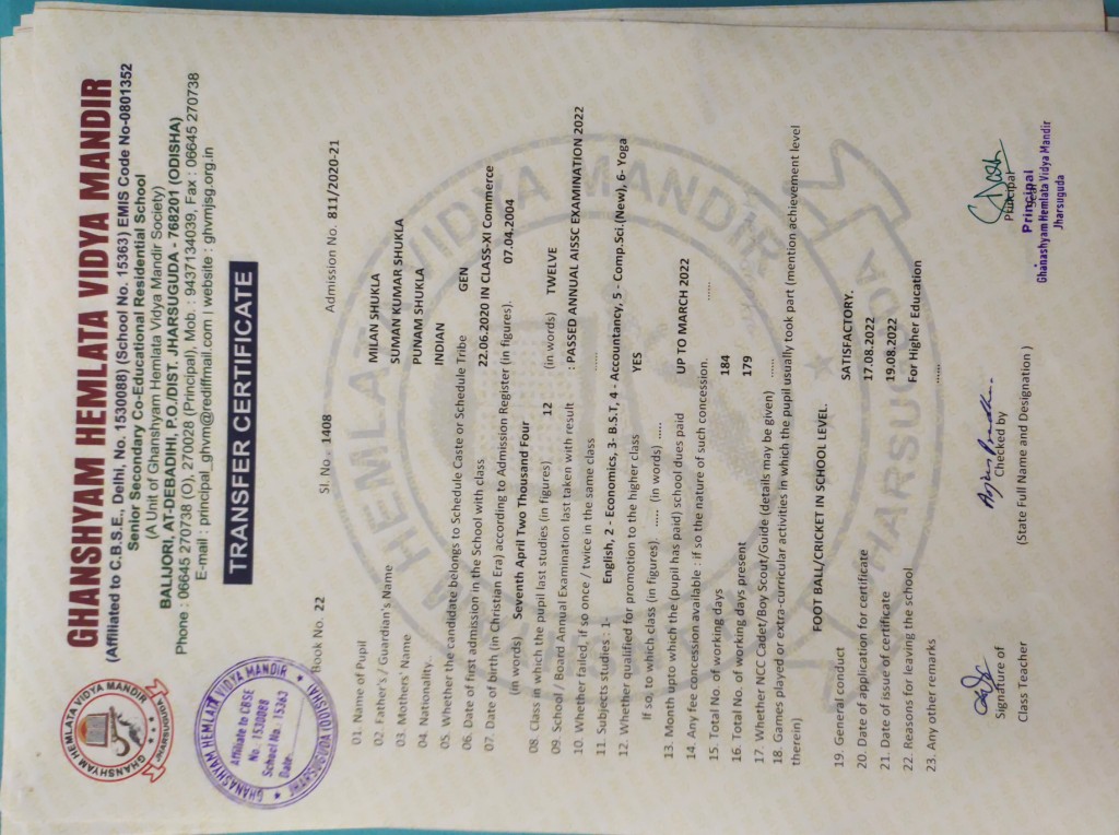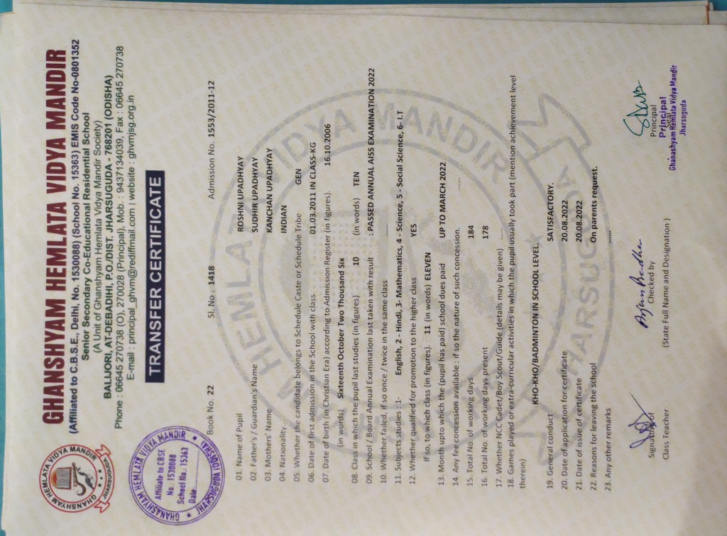 | 24 | 22-8-2022 | 1419 | Amit Kumar Padhan | 3180/2019-20 | View/Download TC |