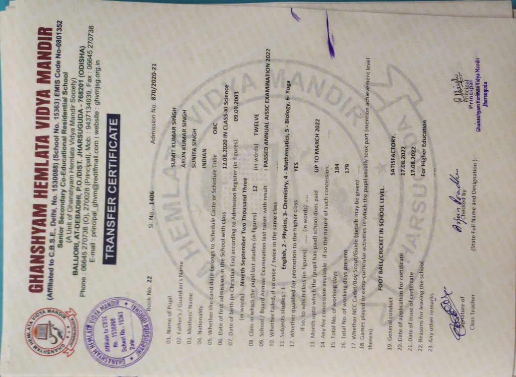 | 15 | 17-8-2022 | 1406 | Sumit Kumar Singh | 870/2020-21 | View/Download TC |