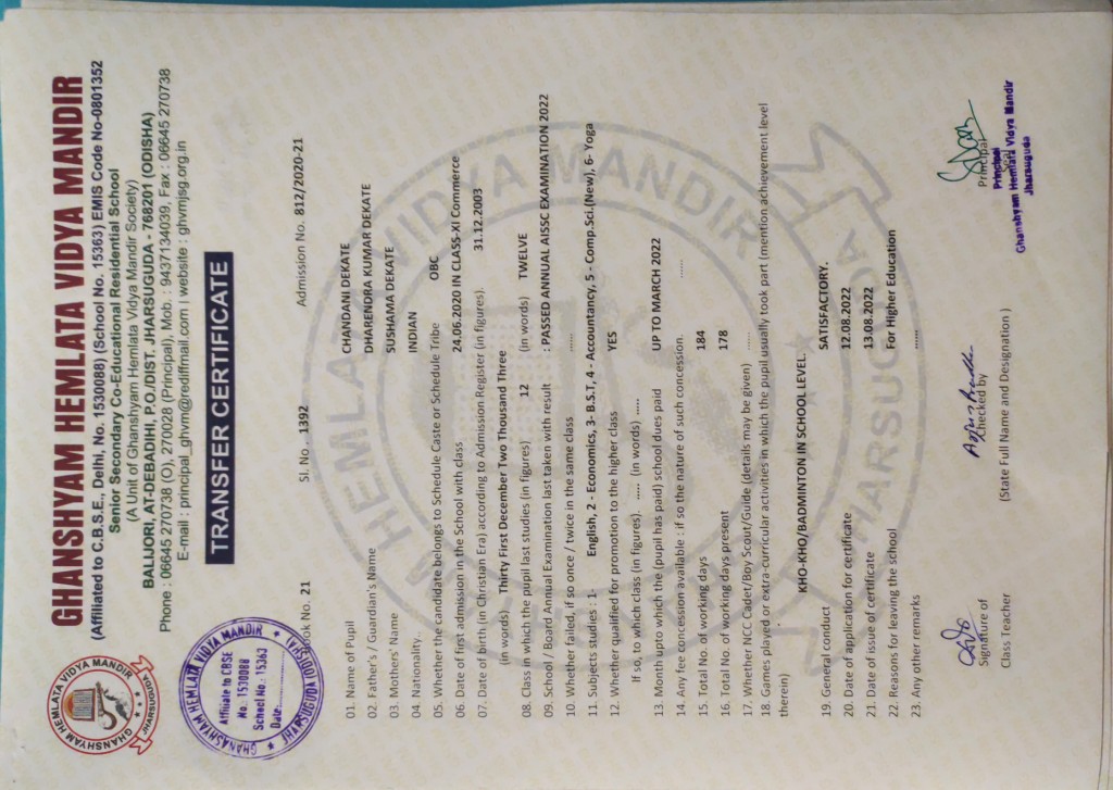 | 14 | 13-8-2022 | 1392 | Chandani Dekate | 812/2020-21 | View/Download TC |