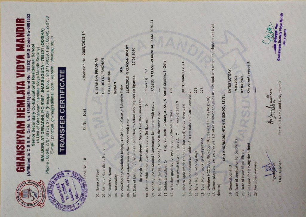 | 41 | Jul 4 2021 12:00AM | 1085 | Dibyansha Pradhan | 2003/2013-14 | View/Download TC |