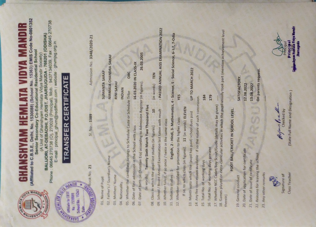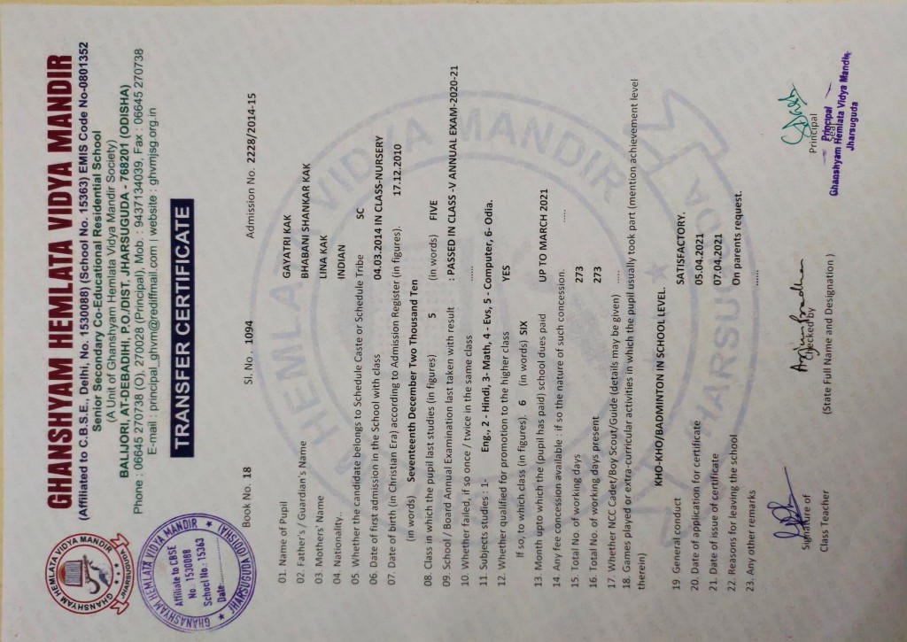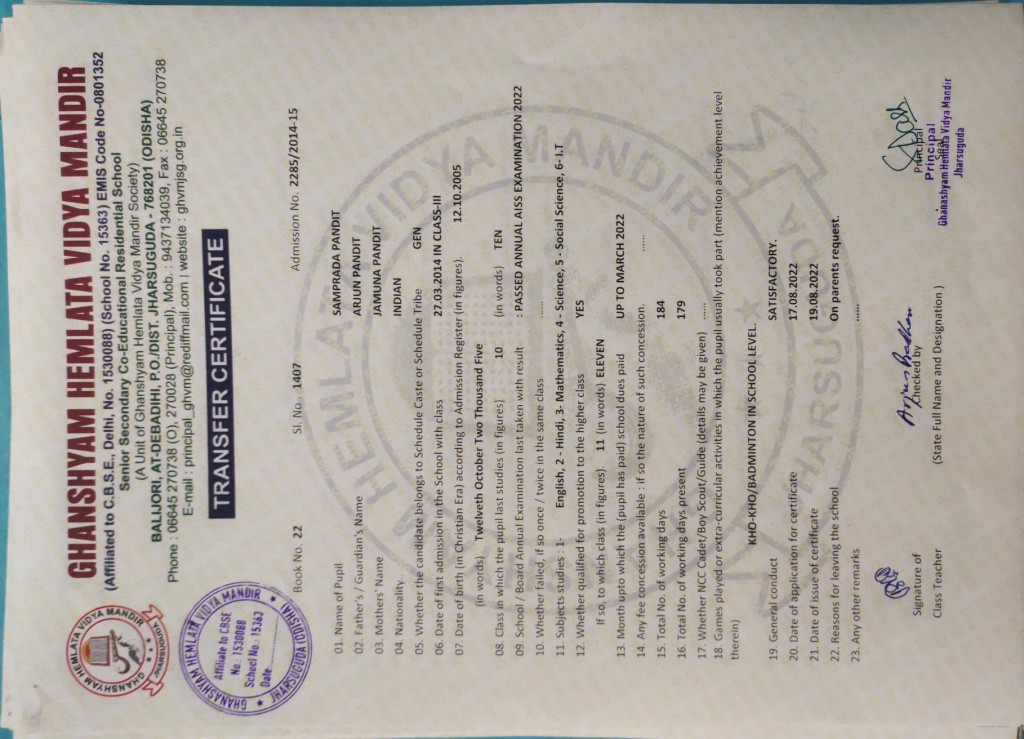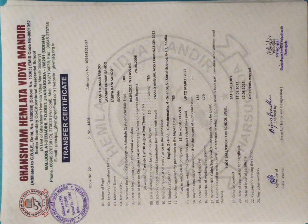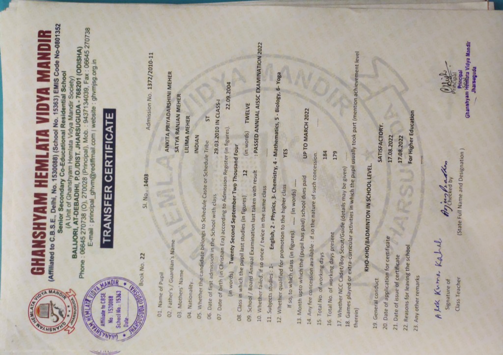 | 7 | 13-8-2022 | 1372 | Sangeeta Pradhan | 2458/2015-16 | View/Download TC |