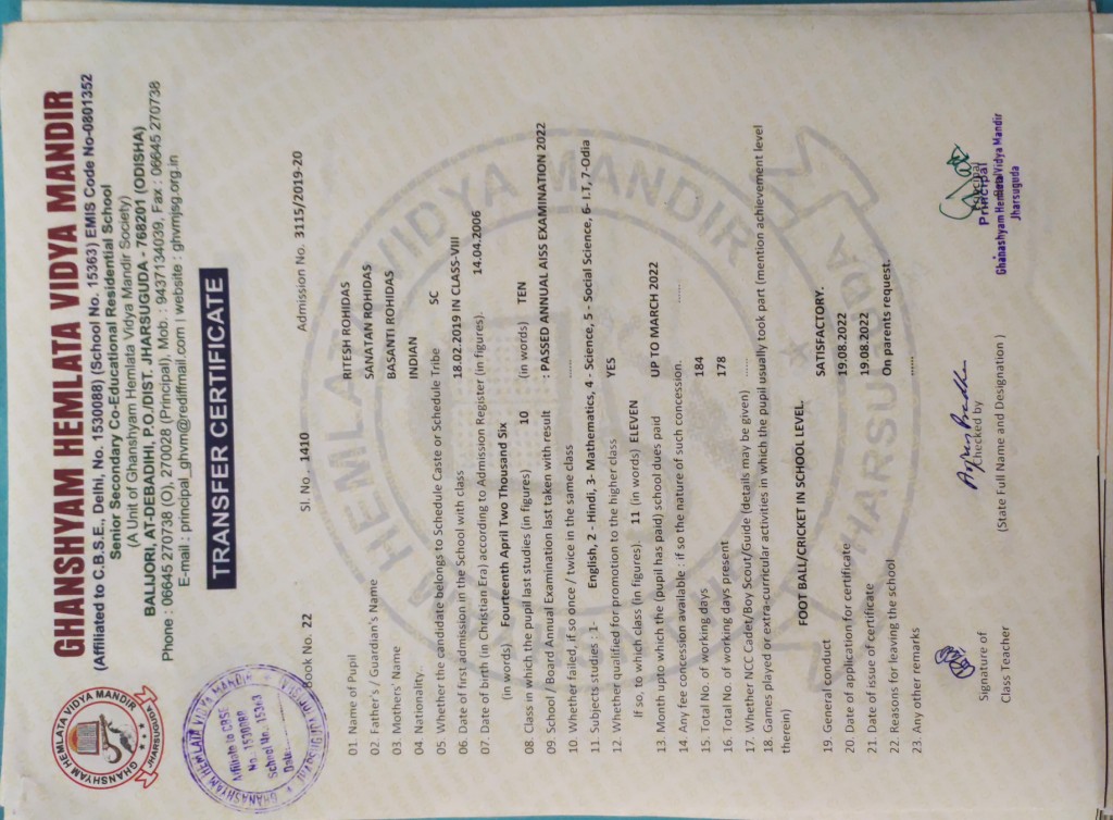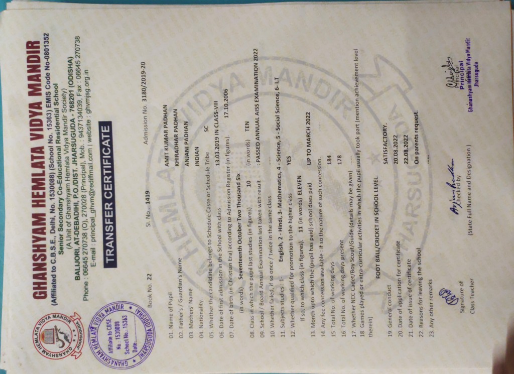 | 24 | 22-8-2022 | 1419 | Amit Kumar Padhan | 3180/2019-20 | View/Download TC |
