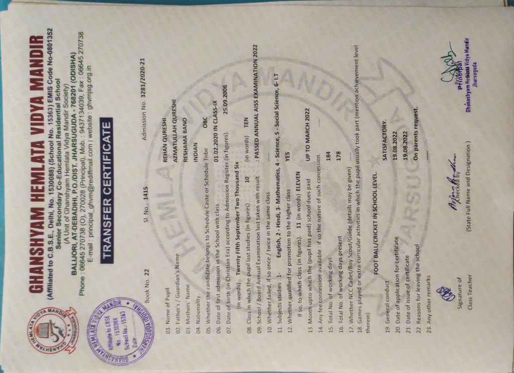 | 19 | 19-8-2022 | 1415 | Rehan Qureshi | 3281/2021-22 | View/Download TC |