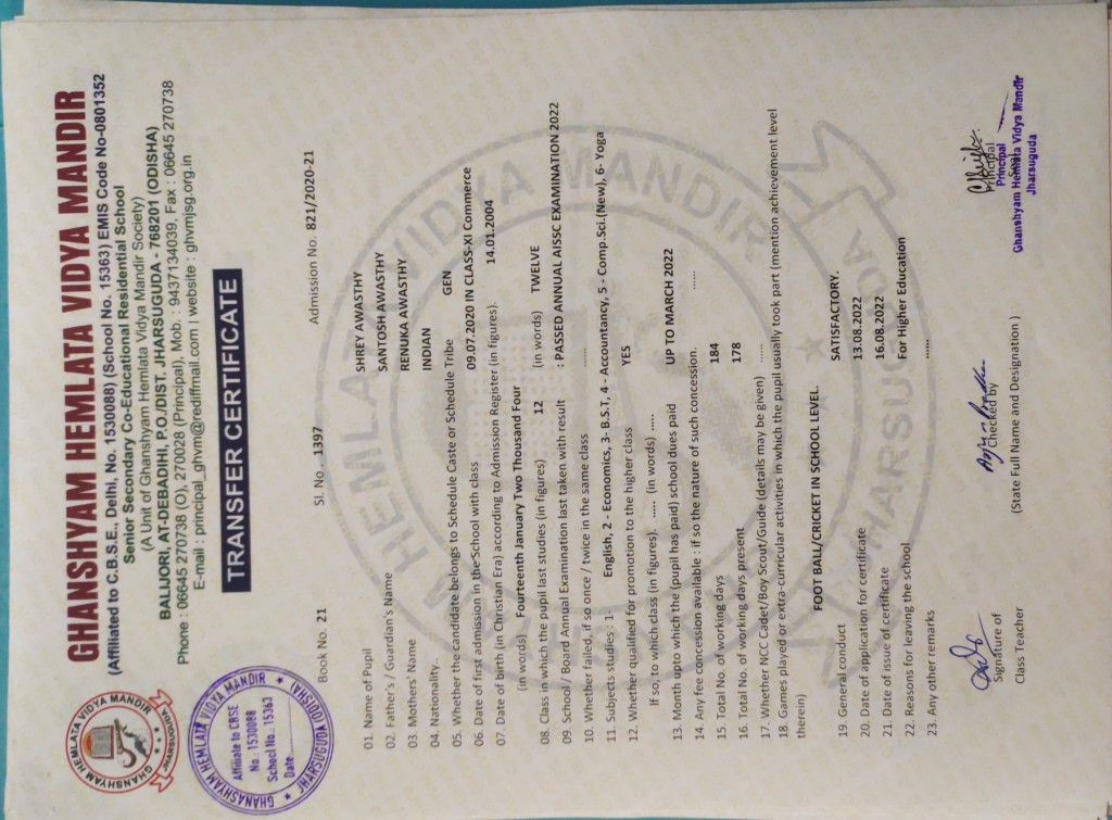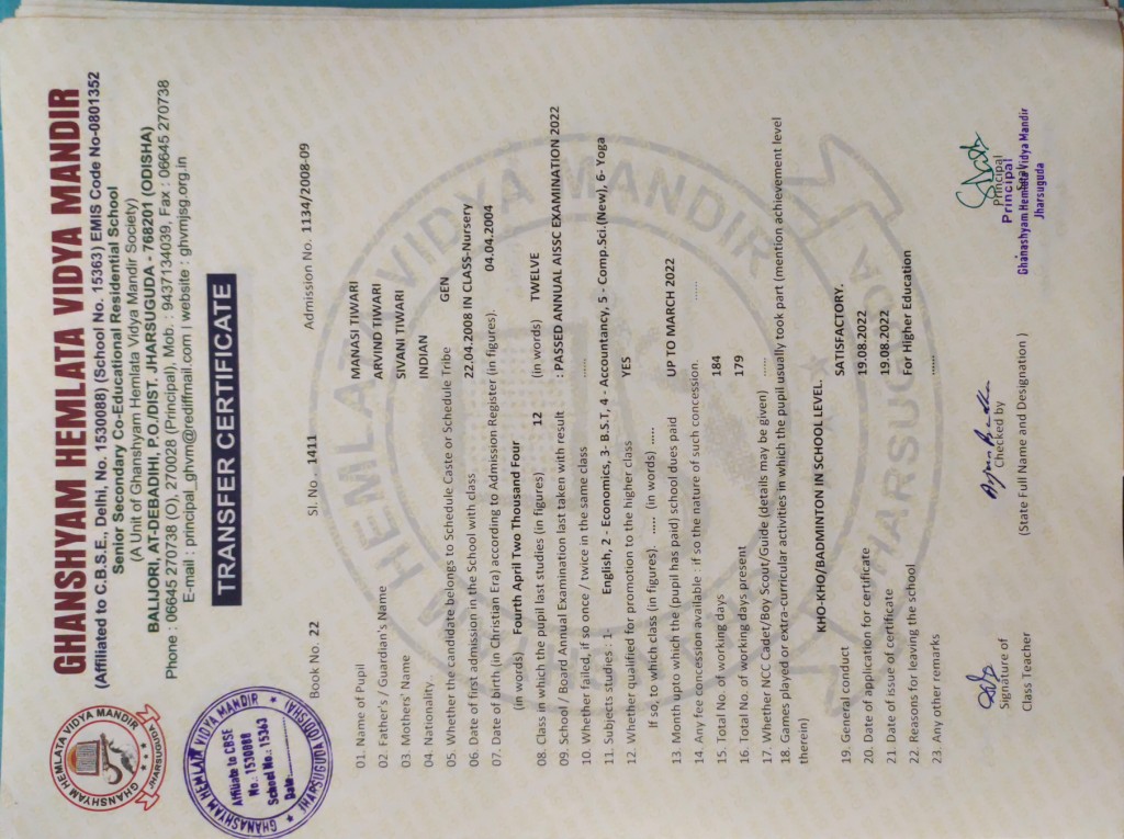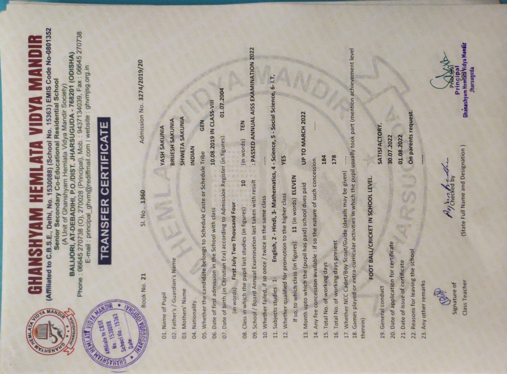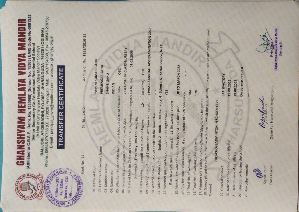 | 17 | 19-8-2022 | 1412 | Yamini Kumari Sahu | 1358/2010-11 | View/Download TC |