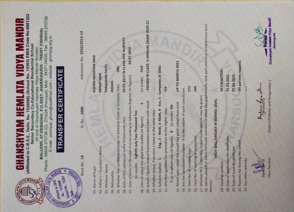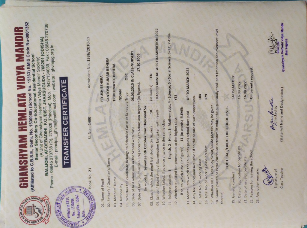 | 2 | 16-8-2022 | 1400 | Piyush Behera | 1336/2010-11 | View/Download TC |